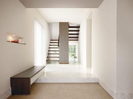 Aさま邸へは、まず小径のようなアプローチを通ってエントランスへ。扉を開けると、白い壁、白い床の人工大理石に囲まれた広いホールに光が満ちていました。ホールの西側と正面に開口部があり、そこからの光がエントランス全体に明るい表情を添えているのです。また、正面中央のスケルトンの階段も印象的で、奥の開口部にはお隣のグリーンが借景のように映り込んでいます。