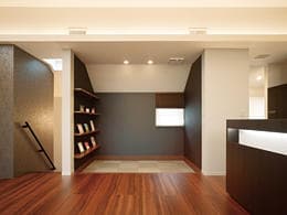 そして2階のパブリックスペースへ。Aさま邸は、1階に主室や書斎、子ども部屋などの個室、洗濯室が配置され、2階にリビング、ダイニング、キッチンがあるという空間構成。特徴的なのは、2階に扉がないことでしょう。「蔵」が設置されている分、天井が高いこともあり、空間全体にすっきりとした抜け感があります。それでいて、ダイニングとリビングの位置をずらしてあるため、落ち着きのある心地よい空間となっています。