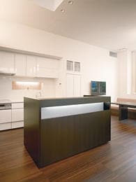 また、照明にもこだわりを発揮。ダイニングにはモダンスタイルの美しいペンダントライトが、リビングにはダウンライトのほか、壁に庇を設けてその内部から天井面に柔らかな光を拡散させるコーブ照明を配置。夕暮れから夜にかけて、照明に明かりが灯ると、空間全体がドラマチックに演出される仕掛けです。さらに、奥さまがこだわったのは、キッチンのアイランド型ワークトップ。ご自分の使い勝手を考えたオーダーメードで、インテリア家具のような美しさです。