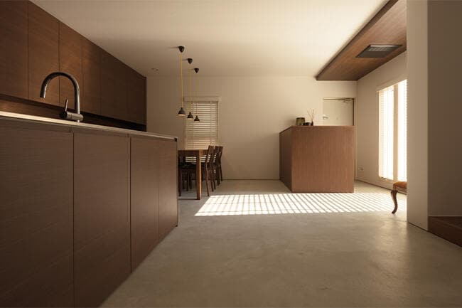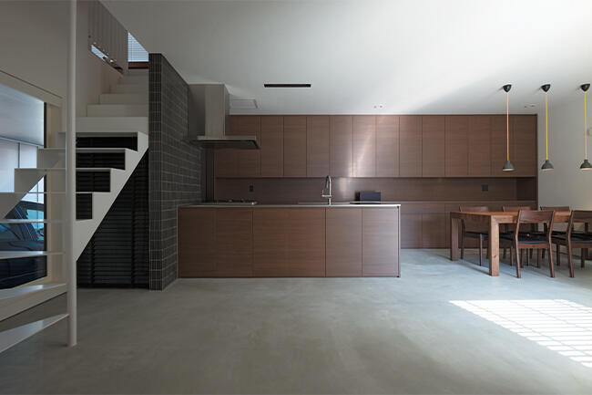 このように、すっきりとした無駄のないフロアが続くKさま邸。それでも空間が殺風景で冷たい印象になることなく、あたたかな表情をつくり出しているのは、空間全体や色調から生まれるメリハリだろう。 ウォールナットのダークブラウンで統一されたキッチンの脇には、白い階段があり、その横にはガレージが見える窓。リビングの床はキッチンフロアよりも20㎝ほど床が高く、キッチンに比べて天井も高い。