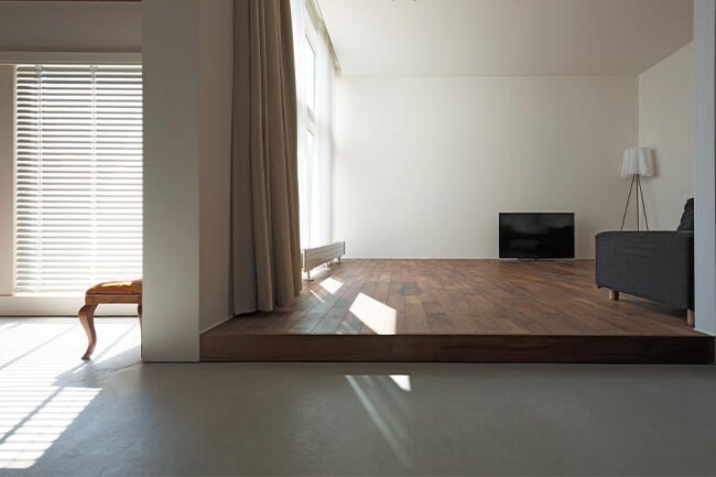 リビングは、大きな開口部と白い壁だけの広い空間だ。ゆったりとしたソファ2台とサイドテーブル、テレビ、ライトスタンドが置かれ、広さが広いままに活かされている。ここは、ソファの背面が見えないように置くことを前提にデザインされているという。
