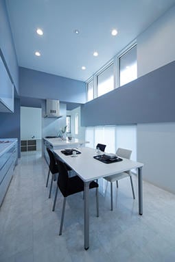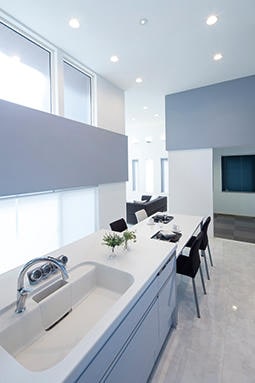 たとえば、パブリックスペース。リビングとダイニングキッチンは敢えて一体化せず、連続させただけのセミオープンに。そのため、空間全体にメリハリができ、居室の役割も明確になりました。リビングの南面には隣家があるため、窓を高い位置に配置。テラスへ続く開口部とともに、隣家からの視線を遮りながら十分な明るさを確保することができます。また、ダイニングとキッチンは一直線に配置することで、効率のいい家事動線も実現。キッチンの奥には家事スペースもあり、使い勝手のよさが好評です。