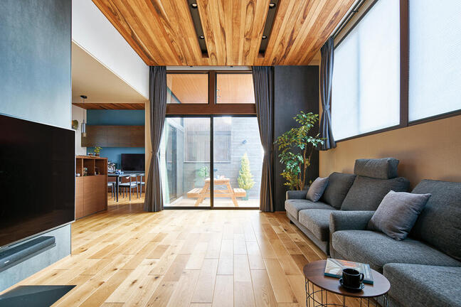 小幅の板を重ね張りしたラップサイディングの外壁や、ウッドデッキ、アメリカンな金網フェンスがカジュアルな雰囲気を醸し出しています。玄関ホールに入るとサーファーズハウスらしさが全開。壁のラックに収められたご愛用のロングボードやずらりと並ぶウェットスーツがインテリアにもなっていて素敵です。「3mもあるボードを抱えて屋内で方向転換するのは大変ですから、玄関に入ってすぐ横の壁面に収納できるのは本当に便利。出し入れがとても気楽になりました」とHさま。リビングを吹き抜けにしたLDKの開放感もお気に入りです。大開口サッシからも吹き抜けの高い窓からも光がふんだんに差し込み、隅々まで明るくて気持ちがいいとのこと。しかも、天井のファンとエアコン一台で夏は涼しく冬は暖かく、どこにいても快適に過ごせるそうです。 LDKとつながるウッドデッキの広さにも目を見張りました。このスペースはご夫妻のライフスタイルに欠かせないアウドアの憩いの場。「海帰りにはサーフィン仲間が大勢でやってきて、バーベキューを楽しみます。多いときは20人ほど集まることもありますよ」とHさまはうれしそう。ウッドデッキは愛犬の遊び場にもなっていて、サーフボードのお手入れにも重宝されています。「建てて3年目ですが、今も最高の住み心地ですね。『早く家に帰りたい!』が二人の口癖になりました」とご夫妻の笑顔がはじけました。