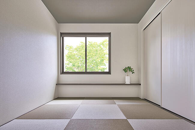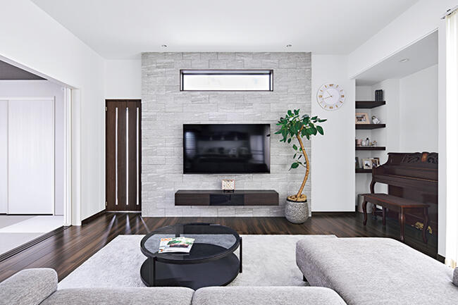 「家族5人が集まって楽しく過ごせる時間と、自分だけで過ごす時間、その両方を大切にできるような住まいにしたいと思いました」と語ります。ご家族の暮らしの中心となるのは、1階に大きく広がる天井高が約2.8mの伸びやかなLDK。大開口の窓から差し込む陽光がシンプルでいて洗練されたモノトーンのインテリア空間を明るく包み、心地よい居場所をつくり出しています。「リビングのソファに座って子どもと談笑したり、隣の和室の畳でくつろいだり、 あるいはダイニングで家族の気配を感じながら読書にふけったり...。みんながほどよい距離感を保ちながら、思い思いにリラックスできるのがいいですね。居心地がいいから、みんなが自然に集まってきて、結局ほとんどの時間をリビングで一緒に過ごしています」とHさま。キッチンスペースは下がり天井で高さに変化を付けて、開放感を損なうことなく、リビングダイニング空間とゆるやかにゾーニング。「お気に入りの広いアイランドキッチンで娘と一緒に料理を楽しんでいます」と奥さまもお喜びです。 住宅性能の面でもHさまは満足されているご様子。こんな大空間のLDKにもかかわらず、「以前の家とは段違いの断熱性能の高さを実感している」と語ります。「夏も冬も、朝起きてから寝るまでずっと快適さが続きます。遮音性も高いので、静かな環境でゆったり暮らせるのもうれしいですね」と笑顔が広がりました。