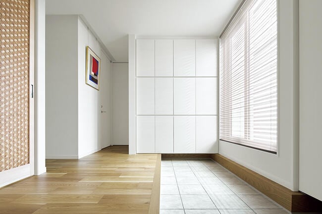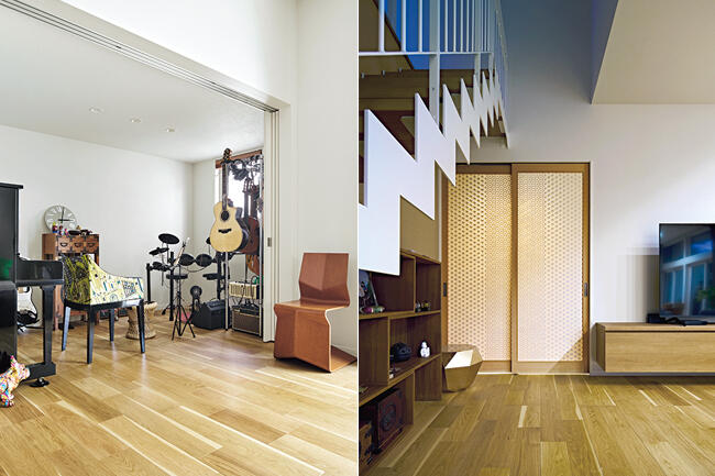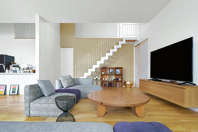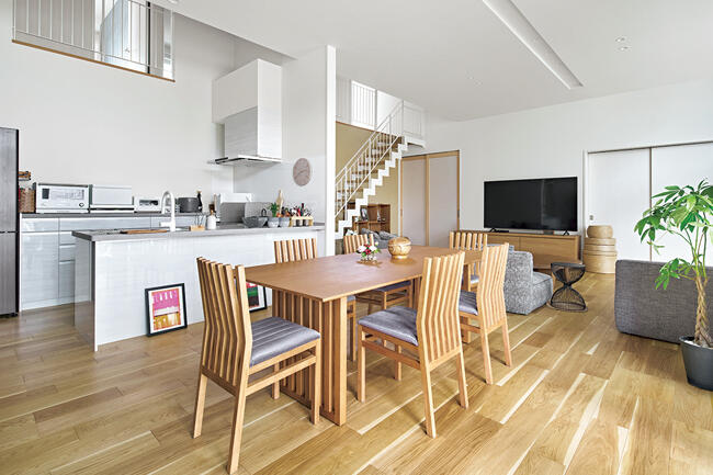 「大きな窓に映る川辺の緑を眺めて、ゆったりとくつろいでいます」とほほえみます。暮らしの中心となるのは、約3mの高天井がつくり出す伸びやかなLDK。これから成長されるお子さまたちとのふれあいを大切にしたいとの思いから、家族の顔が見えやすいリビング階段と大きな吹き抜けを組み合わせた開放的な空間づくりをされました。さらに、リビングから小上がりで接する場所にスタディスペースを配置。「住まい全体がひとつにつながっているので、親子のコミュニケーションも自然に活発になりました」とのこと。一体感のある大きな空間の中で、家族それぞれが自分の居場所を持ちながら、お互いの気配を感じられる住まいとなりました。リビング扉には奥さまがお好きな組子細工を組み込んで、インテリアのアクセントにしています。 収納プランもひと工夫。リビングからも寝室からも行き来しやすい場所に、大容量のファミリークロゼットを設置。そのうえで、パントリーや玄関収納、そして各居室にも収納を設けるなど、"集中収納"と"分散収納"を組み合わせて、手間なく片付く暮らしを実現されています。「部屋がいつもスッキリと保てるので、シンプルな空間にお気に入りの家具が映えるのがうれしいですね」川面から届く風を感じながら心地よく過ごせる住まいになり、「以前にも増して、家族みんなで過ごす時間が楽しくなりました」と幸せそうに語るKさまです。