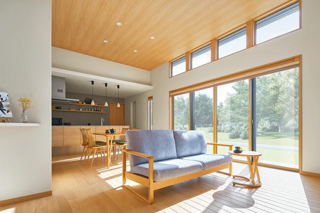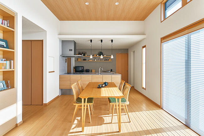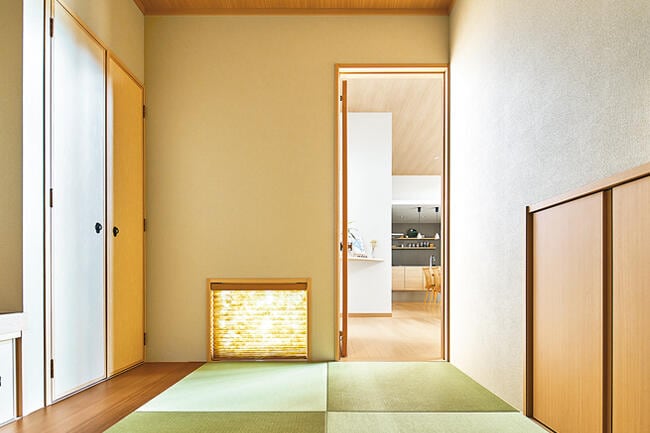 約3mの天井高が伸びやかなLDKは、芝生の庭に面した大開口サッシからも高窓からも光がふんだんに差し込み、日中は照明いらずの明るさです。ヒノキのフローリングと木目天井が美しく溶け合う清々しい空間に、同色のキッチン、竹細工を取り入れたダイニングチェアやソファが調和。奥さまがお好きなグレーをアクセントにしたコーディネイトに洗練されたセンスが感じられます。 リビング・ダイニングを見わたせるキッチンは、背面のグレー壁に付けた棚にお気に入りのティーカップやお酒のボトルが並べられ、下がり天井から拡散する間接照明の灯りと相まっておしゃれなカフェのよう。生活感が漂わないよう、冷蔵庫はリビングから見えない位置に配置しています。お料理好きのご夫妻は、ご友人をたくさん招いて、ここで食事やお酒を楽しむことも多いそうです。リビングの続きにしつらえた和室は地窓から苔の坪庭が眺められ、客間としても、座のくつろぎを楽しむ場としても重宝されています。若いご夫妻が希望されたのは、「愛着を持って永く快適に暮らせる、流行にとらわれない住まい」でした。その思いが和モダンな平屋で叶えられて大満足されています。