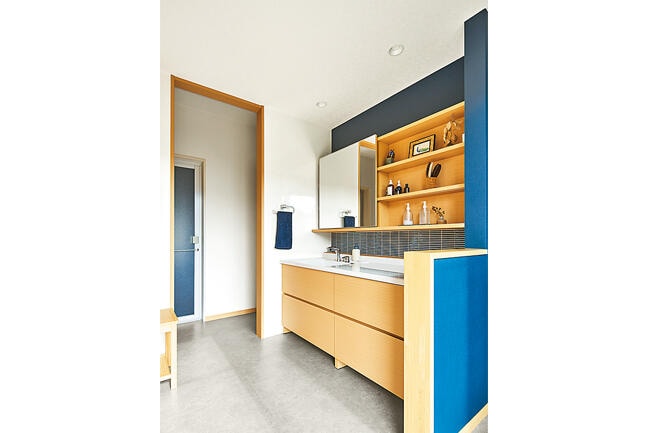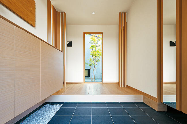 山並みを一望するのどかな田園地に、しっとりと落ち着いた平屋のお住まいを建てられたFさま。玄関ホールに入ると、縦長の窓を額縁に、庭のモミジが一幅の絵のように目に入ります。「玄関から季節の移ろいが感じられる家にしたかったので、モミジが見える演出にしました。お客さまから『素敵ですね』と褒められます」とFさまは語ります。