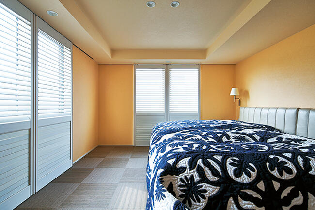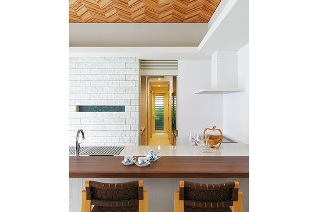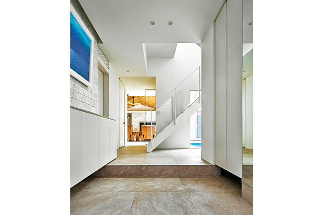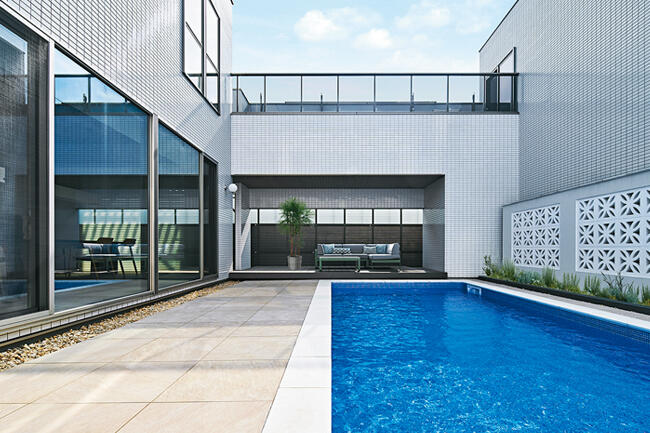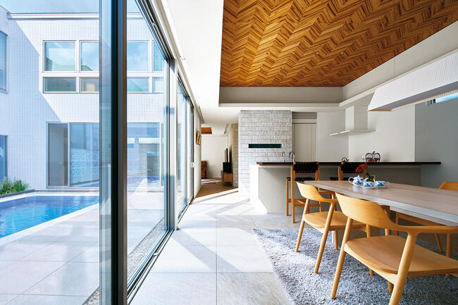 自らプラン図を描いてご要望を形にしていたYさまは、「コンセプトは『都会の別荘』。妻も私も、仕事から帰宅後は思い切りリラックスしたかったので、外部の視線を遮断し、気兼ねなく楽しめる中庭のあるプランを考えました」と振り返ります。その後、中庭はプールとなり、1階にご家族やお客さまが集うパブリック空間、2階に個室などのプライベート空間を配置。プールは、刻々と変化する水面や光の表情を楽しむ水盤の役割も果たし、どこにいても開口部から水辺の景色が感じられます。リビングやダイニングは、ヘリンボーン柄の木天井、天然石の風合いのある床材、ストーン調の壁材など、ナチュラル系のインテリアがさらに癒し効果を高めてくれます。 もう一つ、Yさまがこだわったのが奥さまの動線でした。1階は荷物の移動が無理なくできるよう、勝手口、パントリー、キッチンを直線上に配置。2階はファミリークロゼットとランドリーを隣接させ、洗濯動線をコンパクトに。クロゼット前にはマッサージチェアやウォーキングマシンが置かれ、水辺を眺めながら心身のヘルスケアも可能です。「家事も楽ですし、朝起きてカーテンを開け、窓から空と水面を眺めるのが楽しみになりました」と奥さま。また、昨夏は何度もプールで泳いだと語るYさまは、「部屋ごとに温度調節できる全館空調で、毎日が快適です」と微笑みます。都会の喧噪をよそに、Yさま邸にはくつろぎに満ちた時間がゆったりと流れていました。