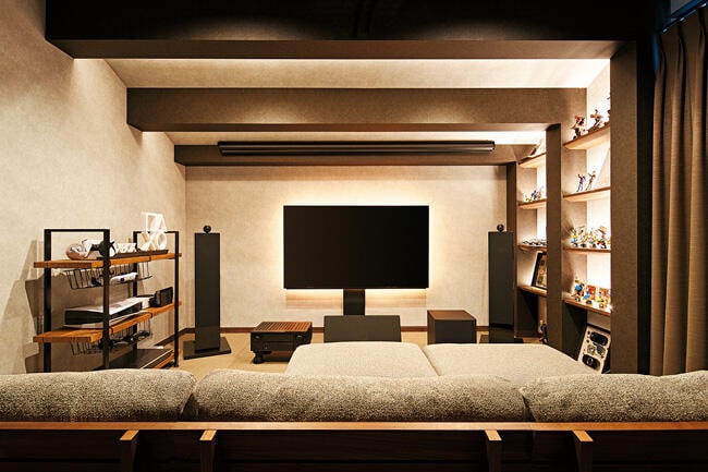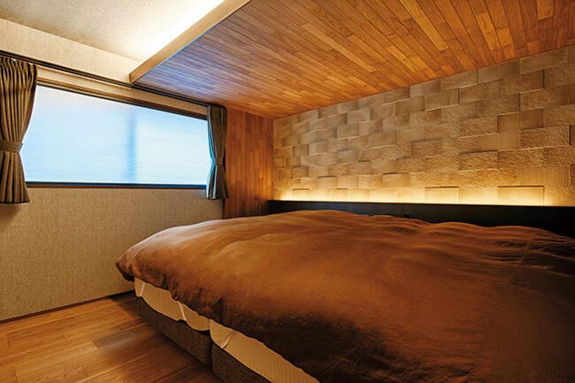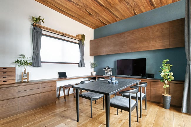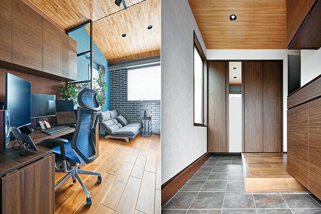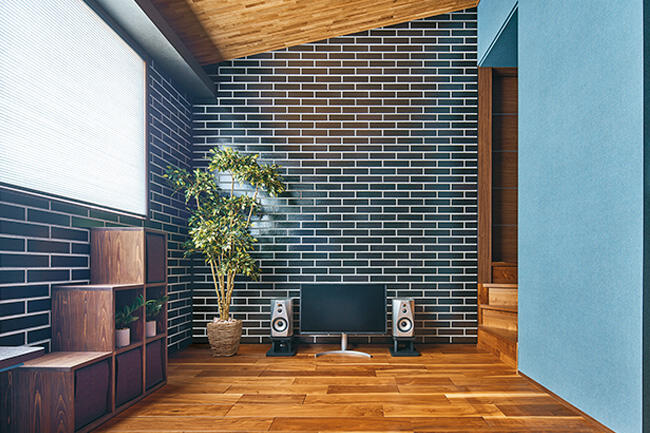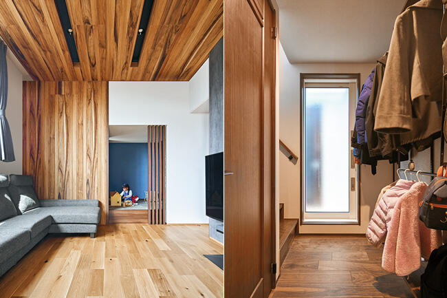 1階の寝室は板張りの下がり天井とタイル調のアクセント壁で落ち着きを出してホテルライクに演出。リビングダイニングは2階に設け、約3mの高天井を板張りにして、木の温もり漂うラグジュアリーな空間にされました。墨色のセラミック壁が天井の木目と調和して、気品のある雰囲気を醸し出しています。リビングとダイニングに囲まれた屋根付きのバルコニーは、アウトドアの憩いの場。「天気の良い日は子どもとバルコニーでピクニック気分を楽しんでいます」と奥さま。リビングの奥には小上がりのヌックがあり、こちらはお子さまのお昼寝の場として重宝されています。奥さまは家事動線の良さもお気に入り。 「玄関ホールにコート掛けがあるので、リビングに上着が置きっぱなしになりません。階段を上がってパントリーからすぐにキッチンに行けるのも便利ですね」と語ります。在宅ワークが主体のUさまは3階に書斎を設け、こちらは黒レンガの壁でブルックリンスタイルに。さらに半階上がったフロアには、遊び心たっぷりのプレイルームがあります。勾配天井を活かし、化粧梁をL字に連ねて船底のようにデザインされた空間は、おこもり感もあって秘密基地のよう。ご家族みんなでゲームを楽しんだり、映画を観たり、書斎からも行き来できるので、「仕事の合間にプレイルームに上がって息抜きをしています」とUさま。間取りもデザインも思い通りの住まいが実現できて大満足されています。