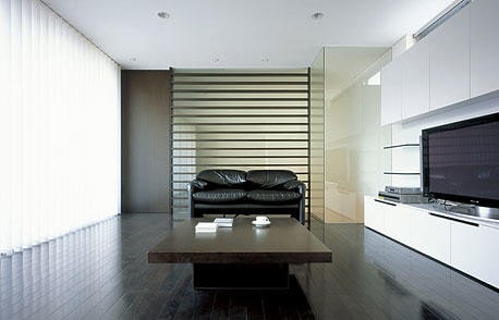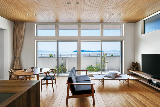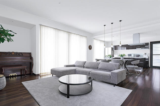 親世帯のリビングは明るい陽ざしが入る2階に設けました。室内は、ホワイトの壁にダークブラウンのフローリングや建具を合わせ、落ち着いた雰囲気に。ピュアホワイトの造り付けTVボードも美しいコントラストを見せています。また、南面の大開口には天井までのバーチカル(縦型)ブラインドを取り付け、光を微妙にコントロールして心地よさを創り出せるようにしています。