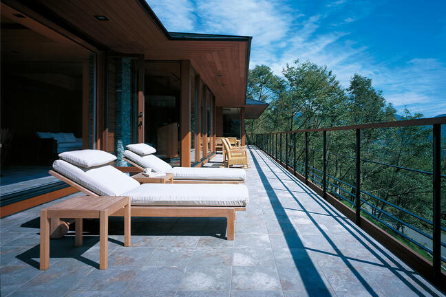 [長野県 Oさま邸] 軽井沢の豊かな自然を見晴らせるバルコニー。深い庇が印象的 ...