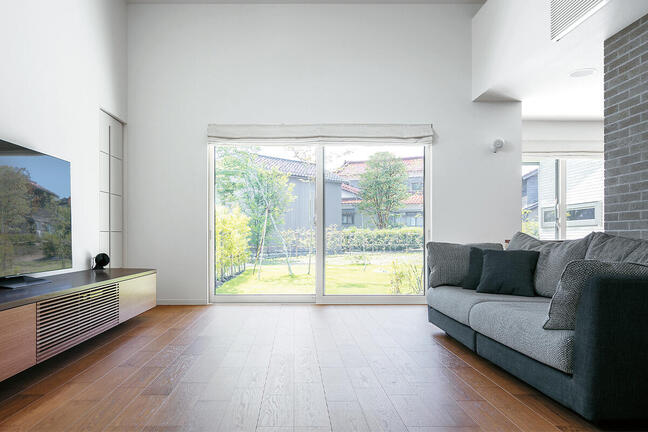 [奈良県 Tさま邸] 愛車を眺めながらくつろぐリビング。一枚ガラスが眺めをグレー...