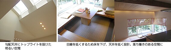 室内は、天井高をそれぞれの空間の用途に合わせて変えることで、変化に富んだ内部空間となっています。