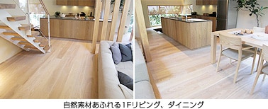 特にリビング、ダイニングの造作家具はオーク材、床はタモ材と自然素材を多用することで温かみのある空間となっています。