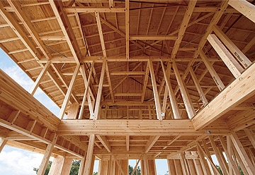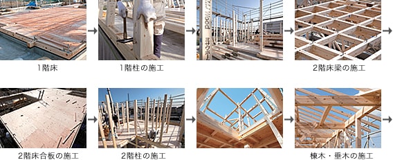 一般的に30坪程の住宅であれば、その日の朝から1階の柱を立てはじめ、なんと夕方には「上棟」してしまいます!大工さんのチームプレーと、工業化による精度の良い柱や梁の事前加工(プレカット)により、あっという間に組み上がって行くんですよ!
