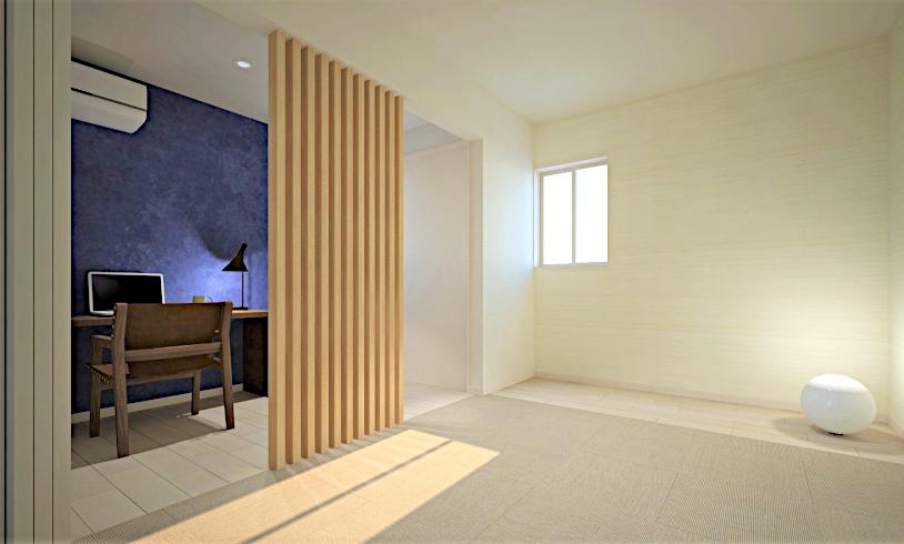 ③木目の縦格子で目隠しをしながらも、家族の気配を感じられる書斎スペース