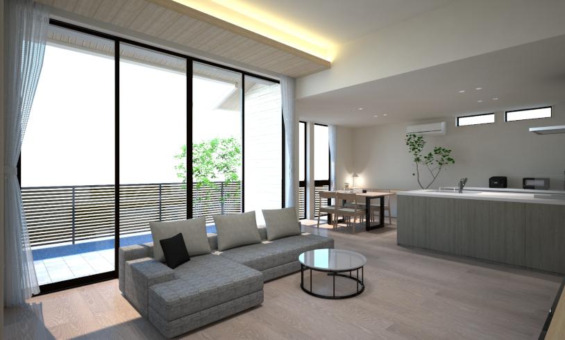 ①高天井と大開口サッシで解放感のあるリビングを演出!