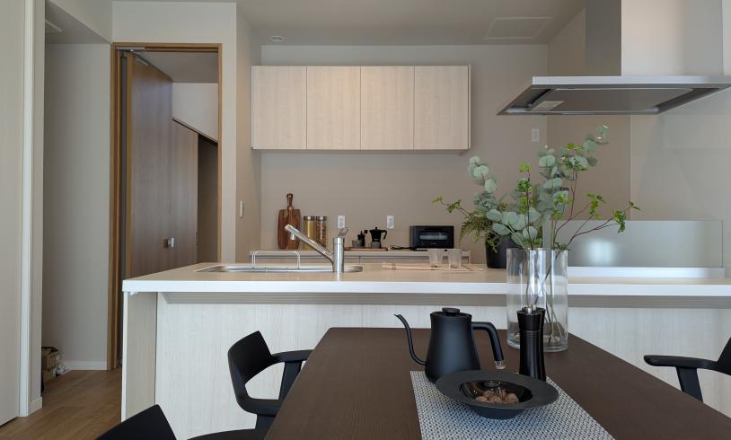 備え付けの家具やシンクの色合いも統一感を持たせ