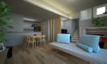 約3mの折り上げ高天井のリビングとスキップフロアが隣接し開放感のあるLDK。