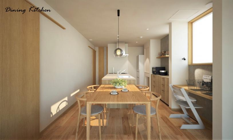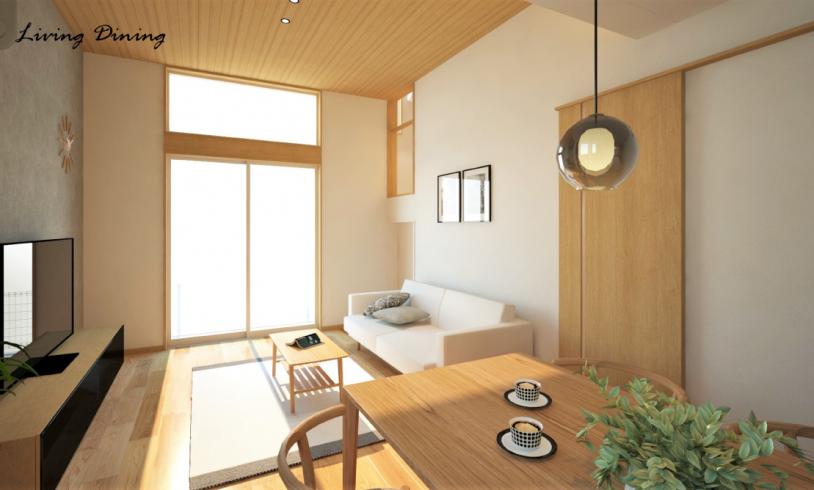 ■天井高約3mの開放的なLDK。キッチンとダイニングが横並びで、