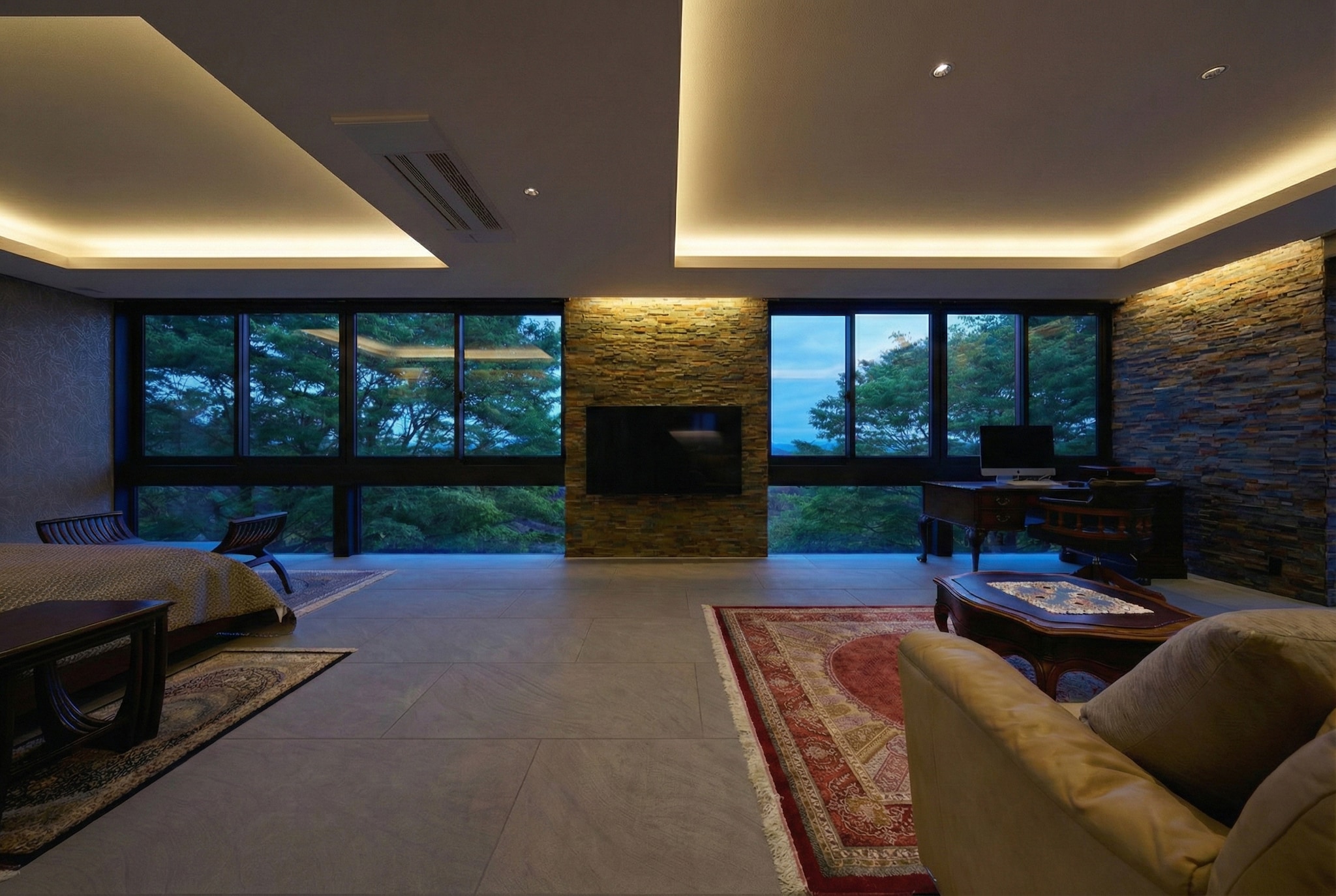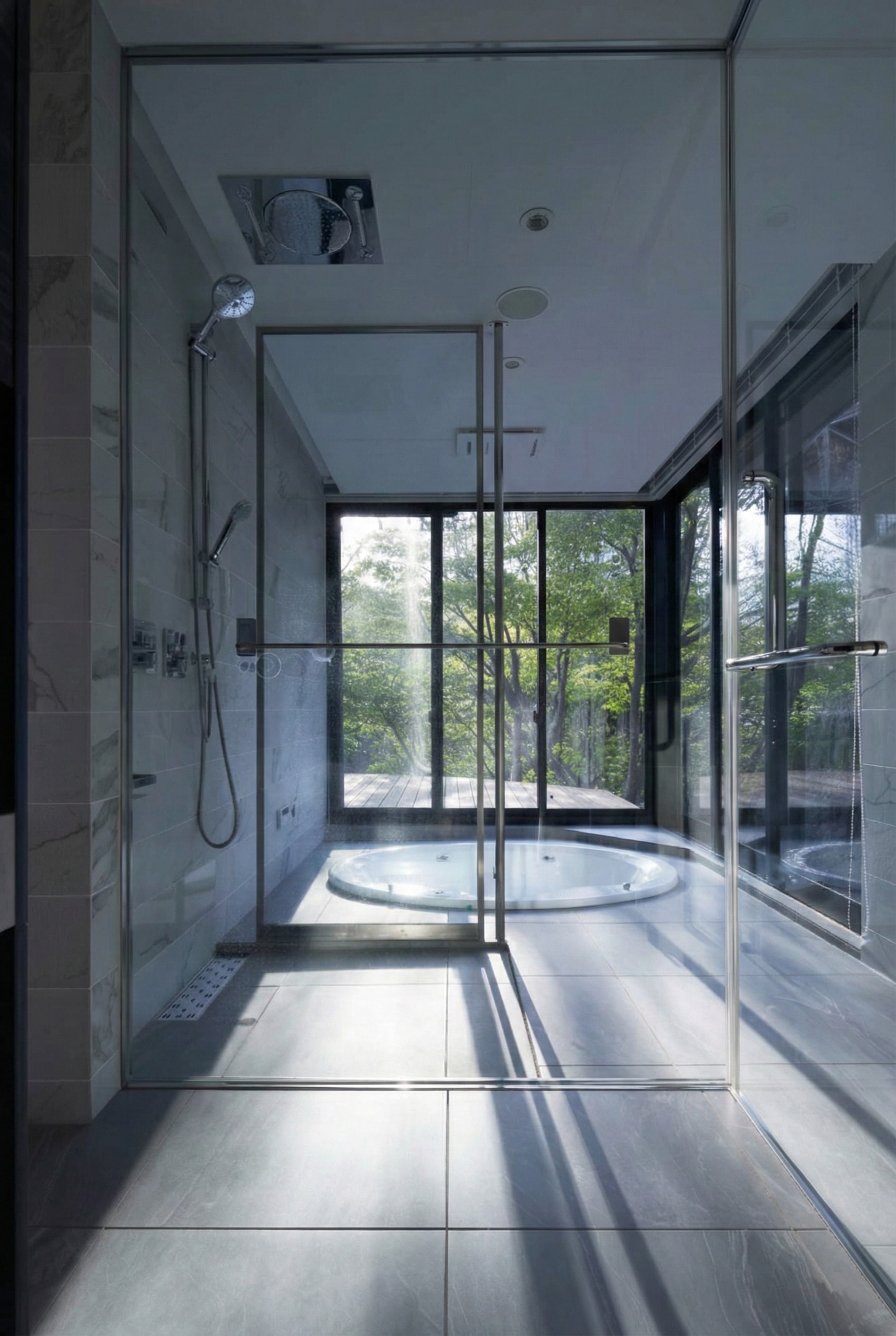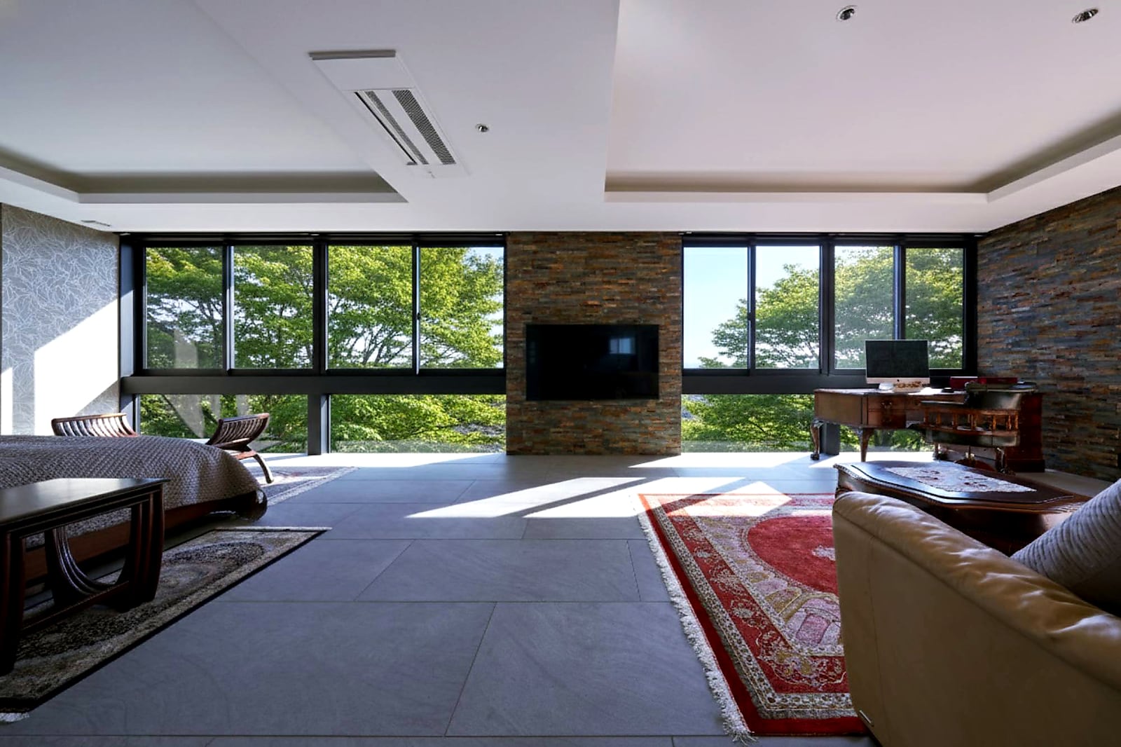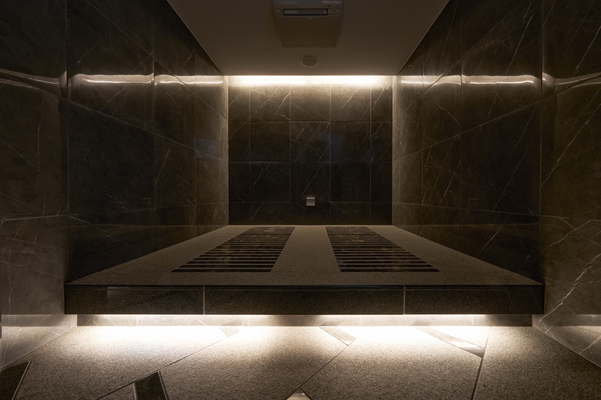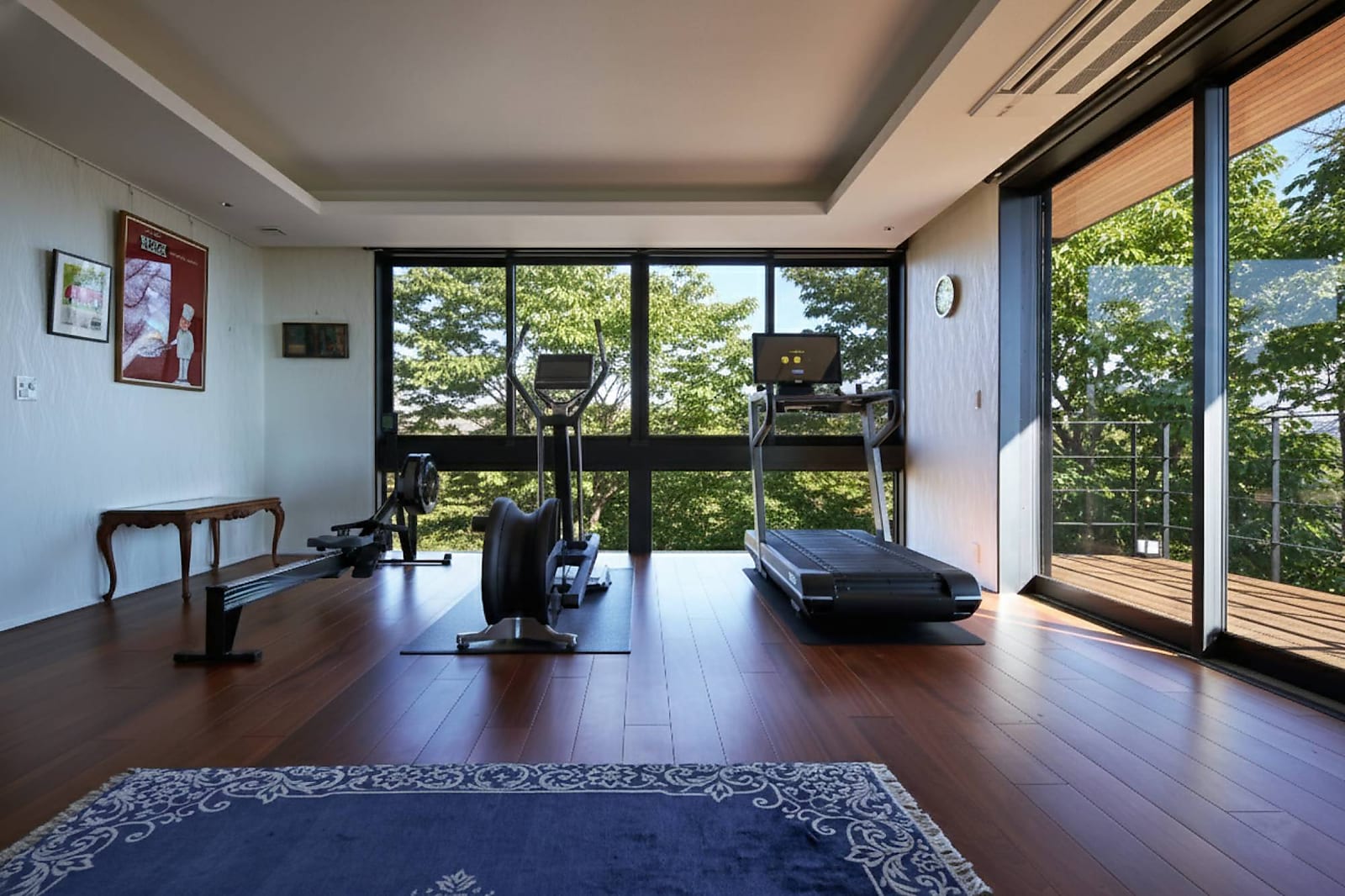 またそこに隣接した1部屋をプライベートジム空間にして、四季の景色を眺めながらトレーニングができる。そしてジムと併せてリカバリー空間として、マイクロフォーム機能付きの浴槽と岩盤浴スペースを設け、コーナー窓をオープンにして庭と一体感のあるバスタイムを楽しめる。