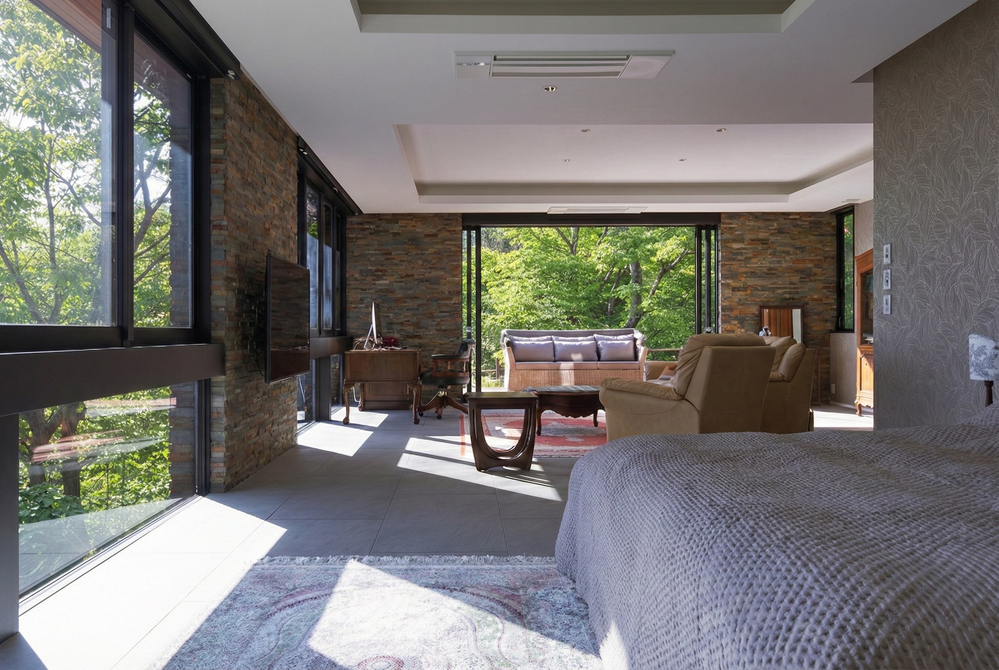 より南向きになった遠景を望む向きには、プライベートリビングとベッドルームを設け、さらに明るい南の庭へと繋がるデッキ空間が広がっている。