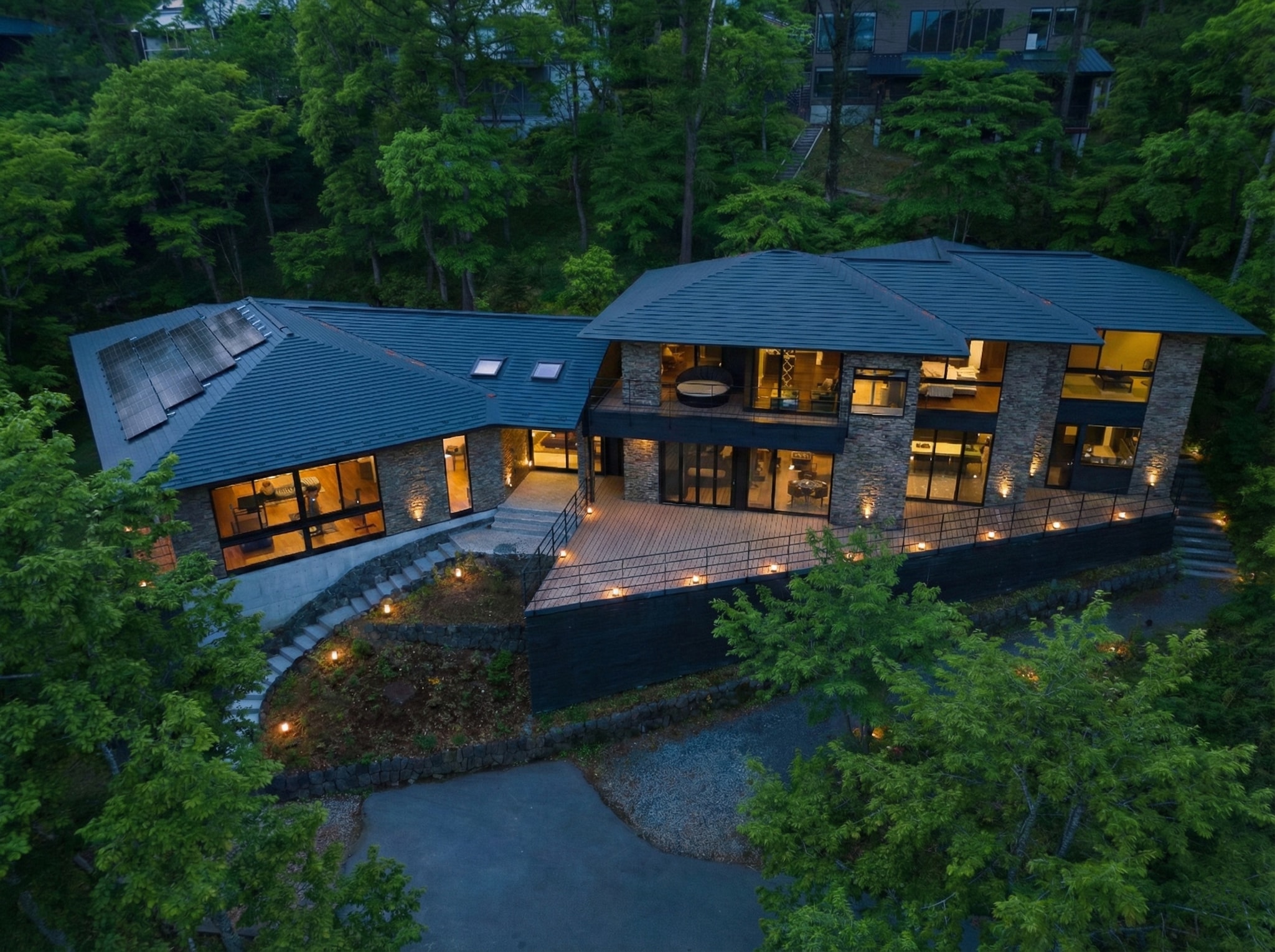 傾斜した敷地の頂上から、周囲の自然を望む軽井沢の別荘。