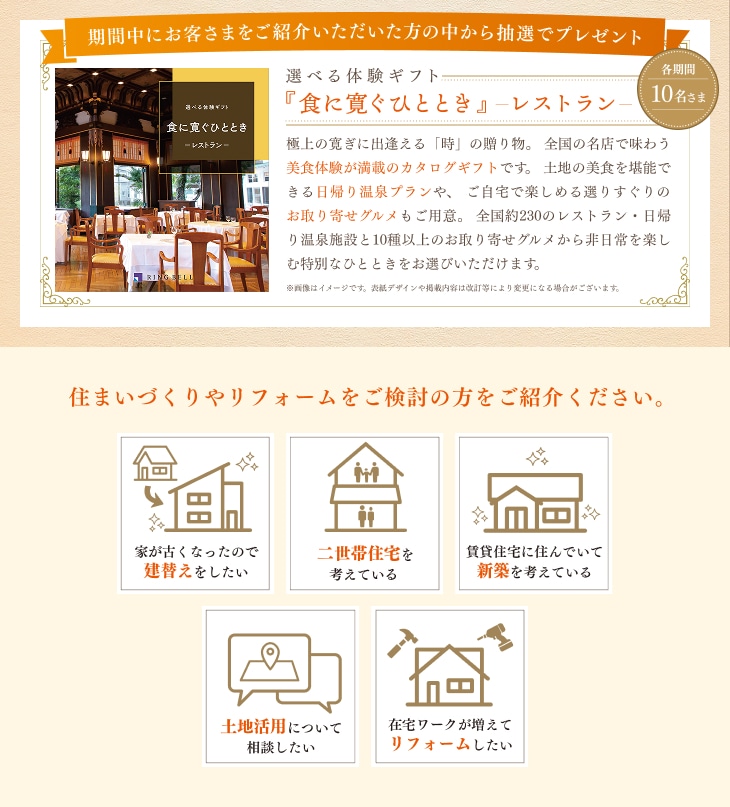 ●キャンペーン概要/新築・建替え・リフォーム・土地活用・不動産売買を検討予定のお知り合いをご紹介いただいた方の中から各期間ごと抽選で10名さまへ「選べる体験ギフト『食に寛ぐひととき』 -レストラン- 」をプレゼントいたします。