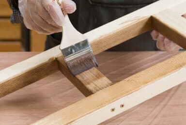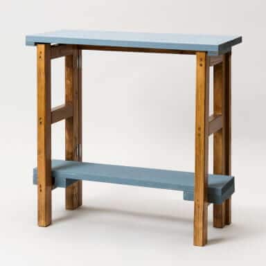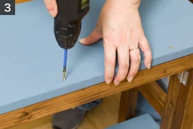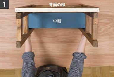 背面の接合部に木工用接着剤をつける。天板の左右が30㎜ずつ出るようにして背面の脚に天板を設置し、仮止めしたスリムビスで固定