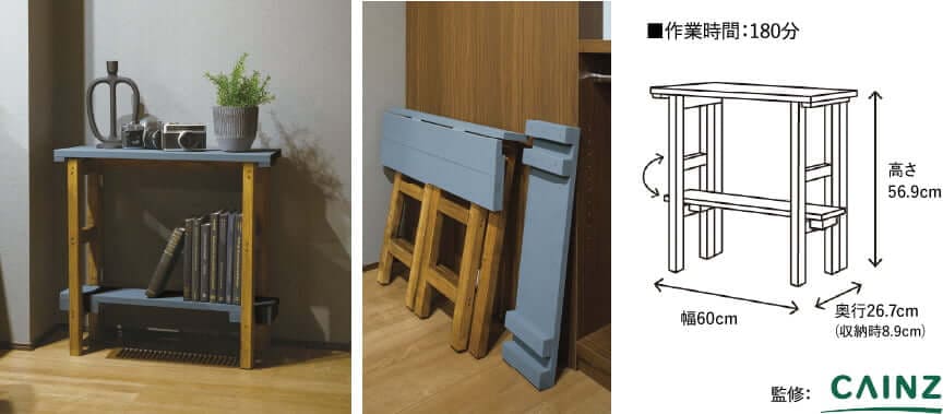 雑貨や小物が飾れる便利なシェルフ。中棚を取り外せば、折りたたむことができるので片づけも簡単。中棚は中段にも下段にも設置できます。