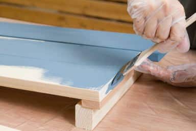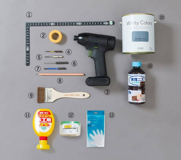 ⑩塗料(今回は、上:ホワイティカラーズ・ディープブルーグレイ、下:水性ニス・オールナットを使用)