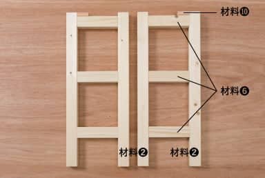 材料❿の接合部に木工用接着材をつけ、左脚の一番上の材料❻の右端に接着し、固定