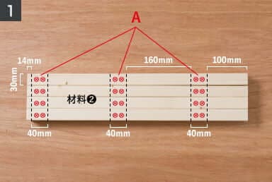 材料❷4本の幅30㎜の面を上にして、右記の寸法を参考に線を引き、貫通穴用の印Aをつける