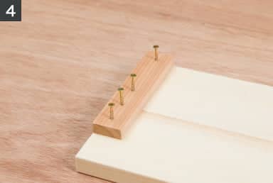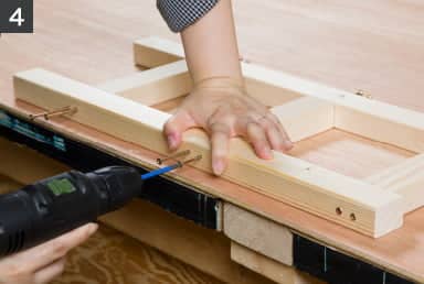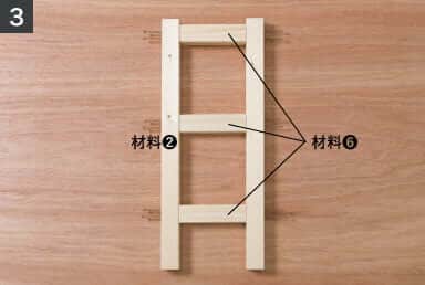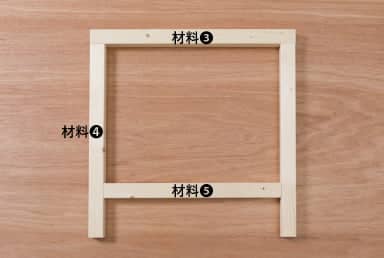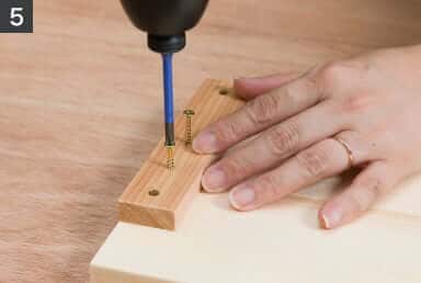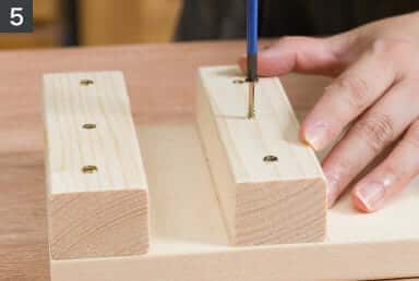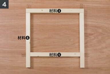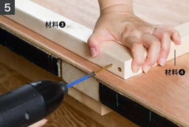 材料❹と材料❸の接合部に木工用接着剤をつけ接着し、仮止めしたスリムビスで固定、材料❺も同様に固定