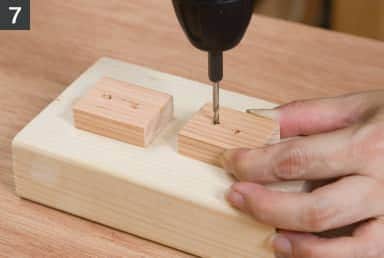材料❼の接合部に木工用接着剤をつけ、材料❽に接着し、仮止めしたスリムビスで固定