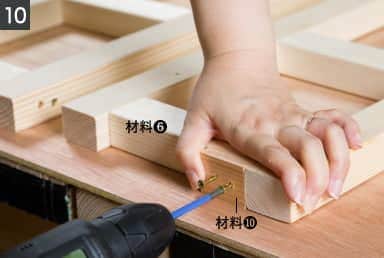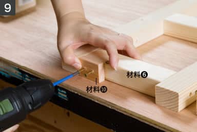 材料❿の接合部に木工用接着材をつけ、右脚の一番上の材料❻の左端に接着し、仮止めしたスリムビスで固定