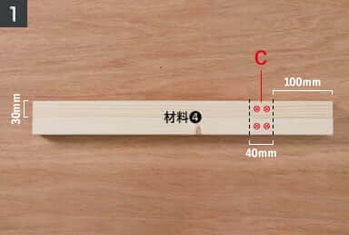 材料❹の幅30㎜の面を上にして、上記の寸法を参考に線を引き、貫通穴用の印Cをつける