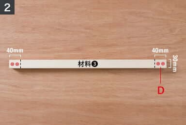 材料❸の幅30㎜の面を上にして、上記の寸法を参考に線を引き、貫通穴用の印Ⅾをつける