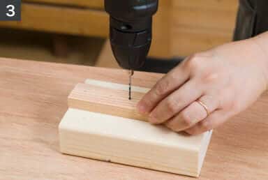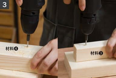 電動ドライバーにドリルビット3㎜をつけ、端材の上で、材料❹の印Cと材料❸の印Ⅾに貫通穴をあける