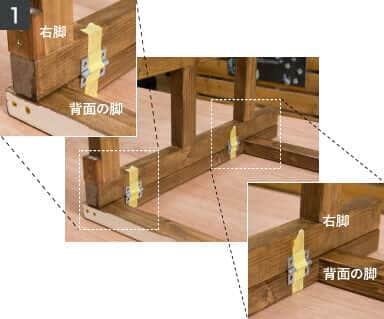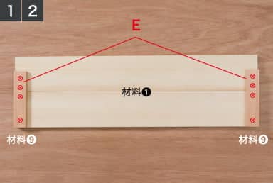材料❾の接合部に木工用接着剤をつけ、上記を参考に材料❶に接着し、仮止めしたスリムビスで固定