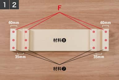 材料❼の40mmの面を上にして、上記を参考に貫通穴用の印Fをつける