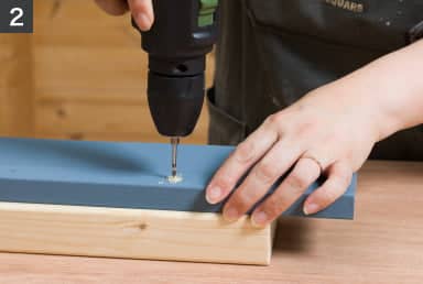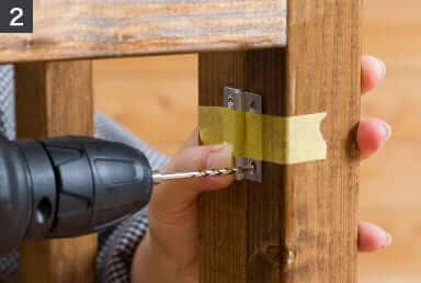 天板側を下にして、電動ドライバーにドリルビット2~2.5㎜をつけ、丁番のビス穴に下穴(2~3㎜)をあける