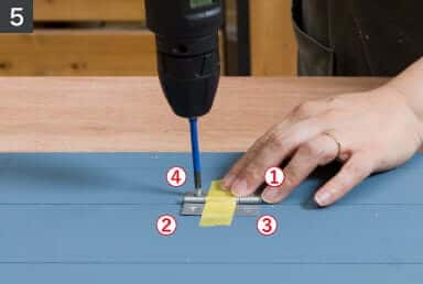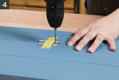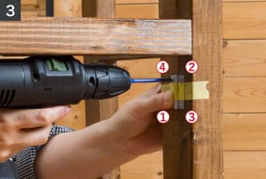 電動ドライバーにドライバービットをつけ、丁番の付属ビスを①~④の順で固定し、マスキングテープをはがす