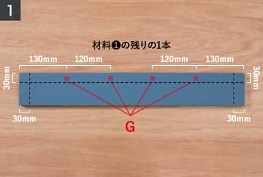 材料❶の残りの1本のきれいな塗装面を下にして、上記の寸法を参考に貫通穴用の印Gをつける