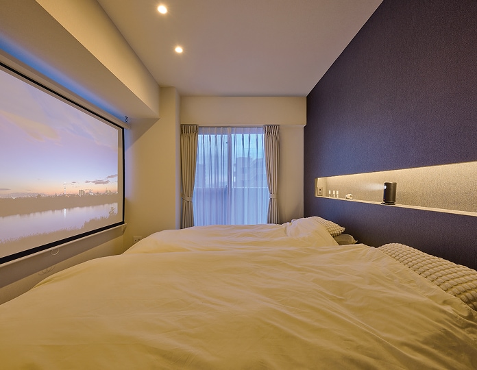 プロジェクターも設置できるニッチ収納を造作した寝室。ダークグレーのクロスが、ゆったりくつろげる雰囲気を演出します。 -