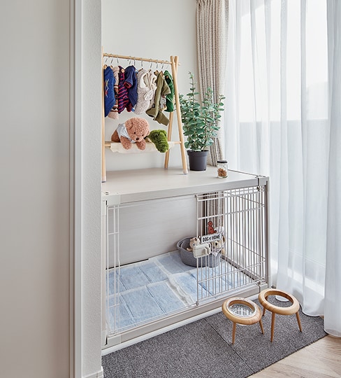愛犬のケージがぴったり納まる専用スペース。
