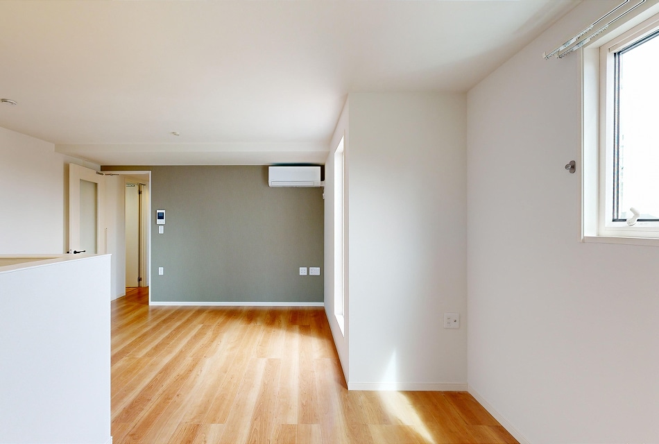 対面型のキッチンは、開口部に向けてレイアウトした明るいスペースです。カウンターを高くして、キッチンでの作業をリビングやダイニングから見えないように工夫しました。LDKのインテリアはホワイトカラーを基調に、壁の一面だけ色を変えてアクセントに。床は木調のフローリングとして、ぬくもりのある雰囲気を演出しています。リビングの外には、眺めのいいルーフバルコニーも設置しました。また、クロゼット付きの2つの洋間は、ひとつはLDKの隣に、もうひとつは玄関ホールにレイアウト。どちらも二面開口で、採光・通風性にすぐれています。